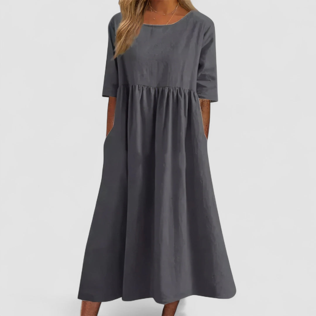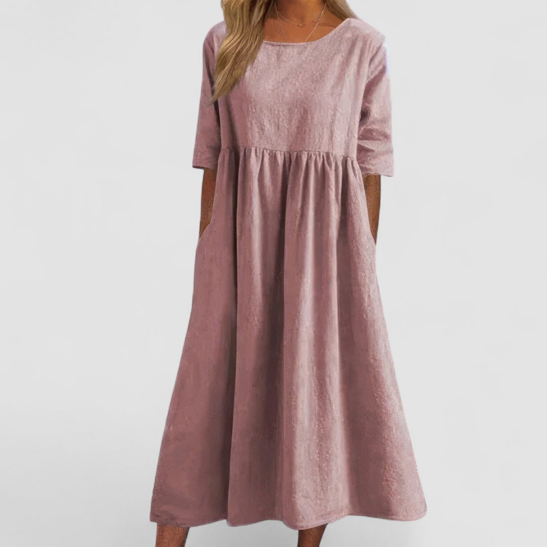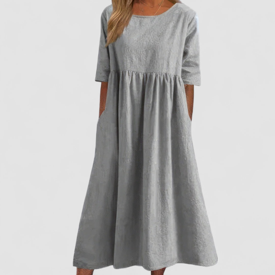 Trött på stela klänningar som inte framhäver din figur? Pocketklänningen i bomull Elsa™ är lösningen! Med ett mjukt tyg, smickrande passform och praktiska fickor, gör den din dag både enkel och stilfull.